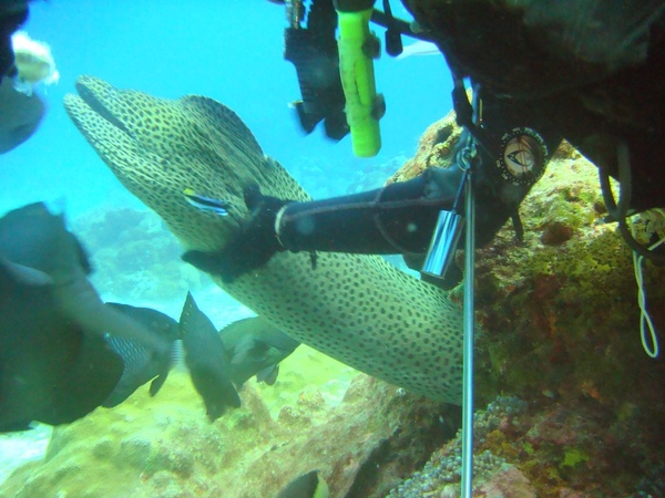 我們的潛水教練在綠島海域固定餵養了幾隻黑斑裸胸鯙